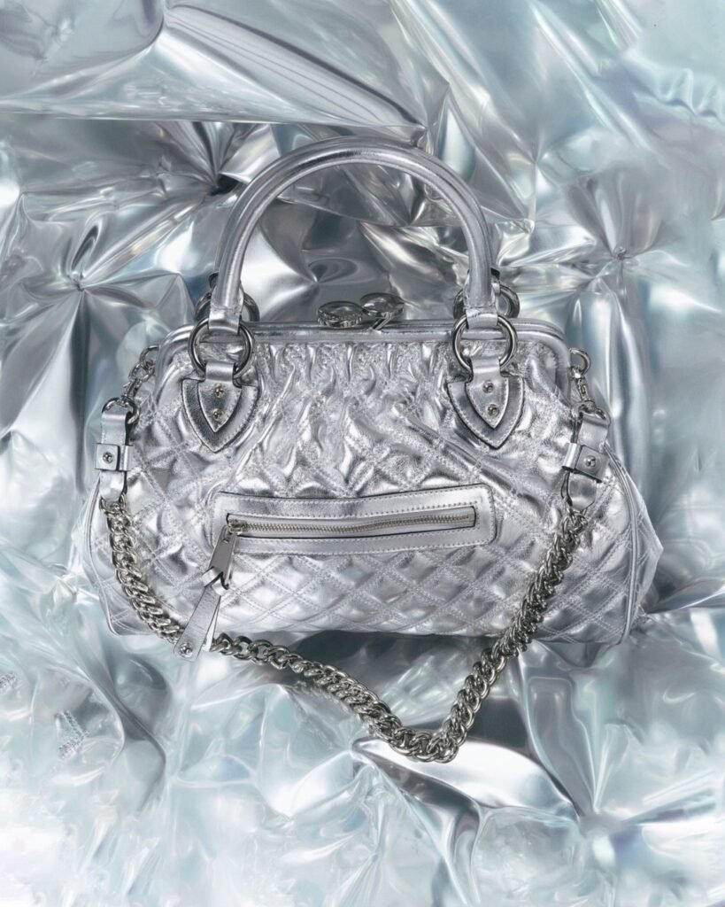 Marc Jacobs brings edgy allure with this metallic leather bag. Modern and chic, it stands out, reflecting both contemporary trends and holiday opulence.