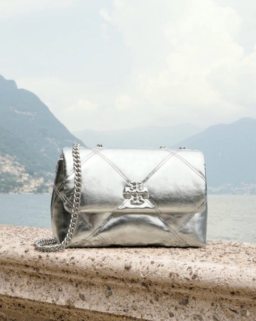 Tory Burch’s Kira Diamond Bag, with its glistening accents, is a dream accessory. The piece elegantly bridges contemporary cool and classic elegance.
