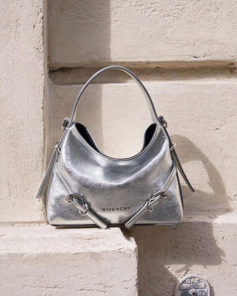 Petite and powerful, the Givenchy Voyou Nano Bag is a must-have accessory that merges practicality with Parisian chic, adorned in sleek metallics to captivate every gaze during festive nights.