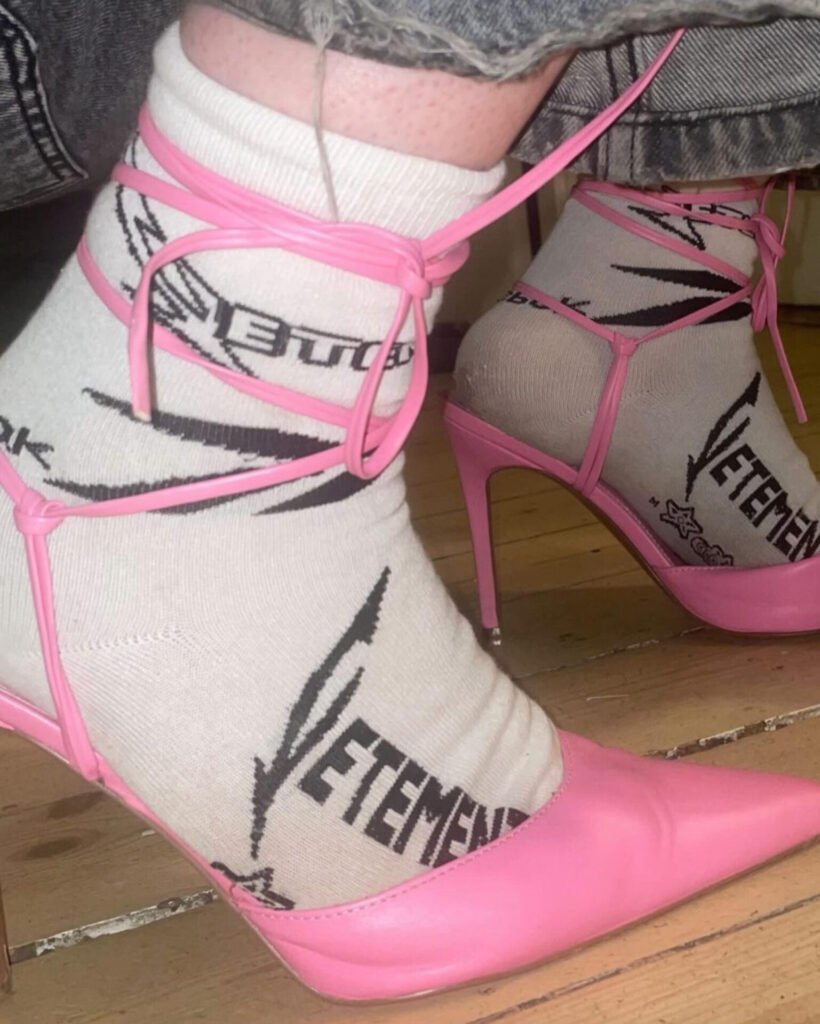 Vetements leans into the rebellious spirit of this trend, styling sporty logo socks with pointed stilettos for a high-fashion-meets-streetwear aesthetic.