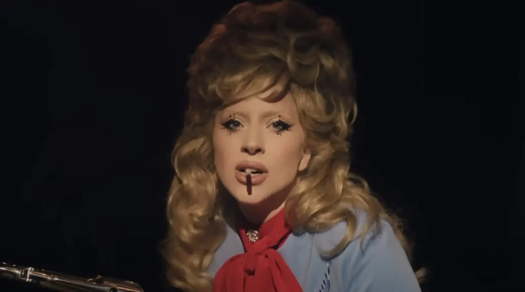 In “Die with a smile,” Lady Gaga sports an avant-garde look reminiscent of punk aesthetics. Her complexion is pale, almost ghostly, contrasting with her heavily lined eyes, elongated towards the temples. Intense black covers the entire eyelid, creating a deep and dramatic gaze. A nude, almost invisible, lipstick completes the look, emphasizing the intensity of her eyes.