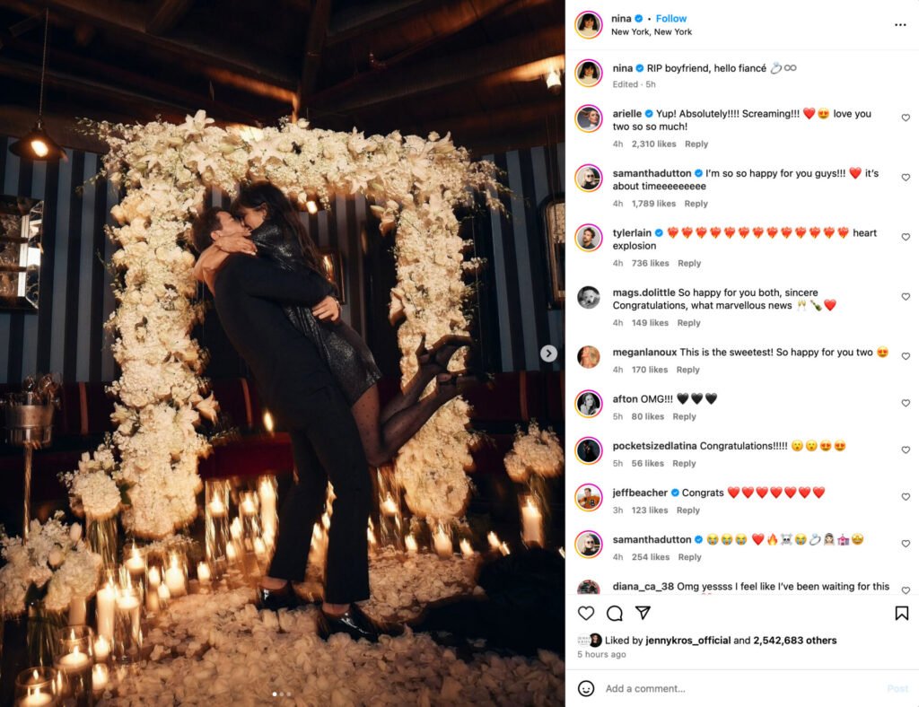 In the glow of her “yes,” the couple celebrated until the early hours with friends, topping off the evening with Shake Shack and dumplings after realizing they’d forgotten to eat. Shaun’s stunning Lorraine Schwartz ring, photos of the proposal, and the caption “She said YES 💍♾️” later made their way to Instagram, while Nina playfully wrote, “RIP boyfriend, hello fiancé 💍♾️.”